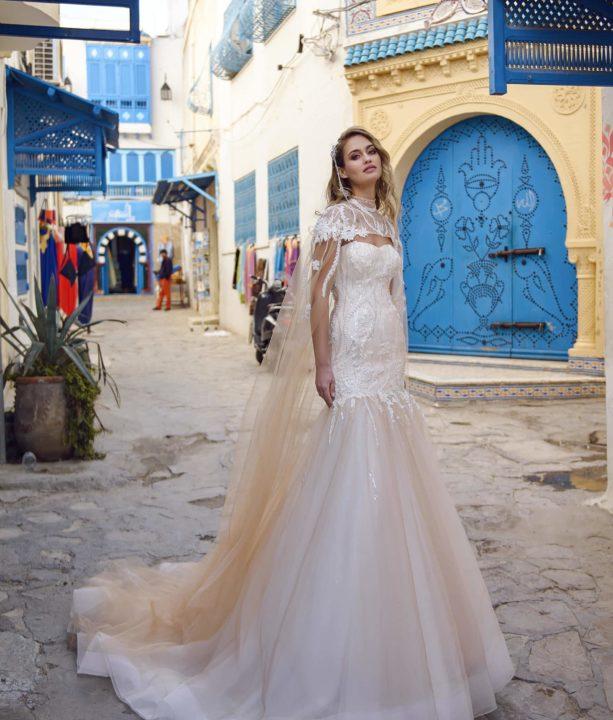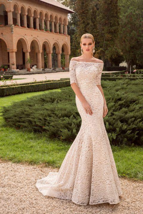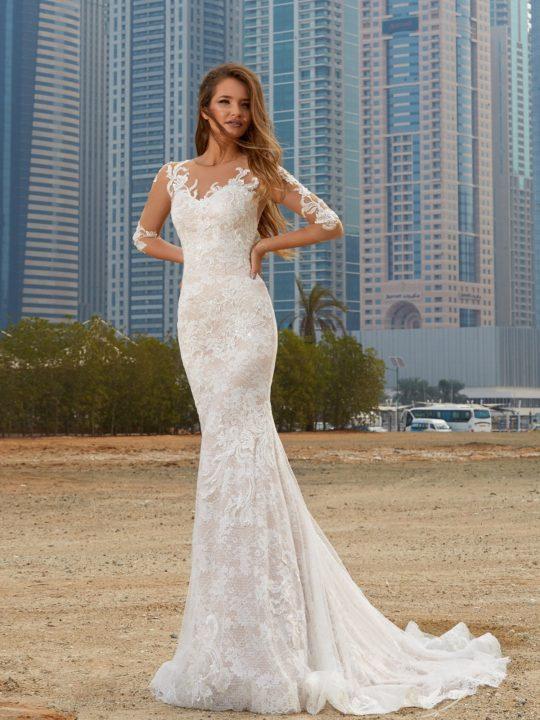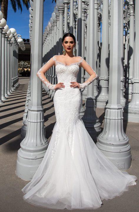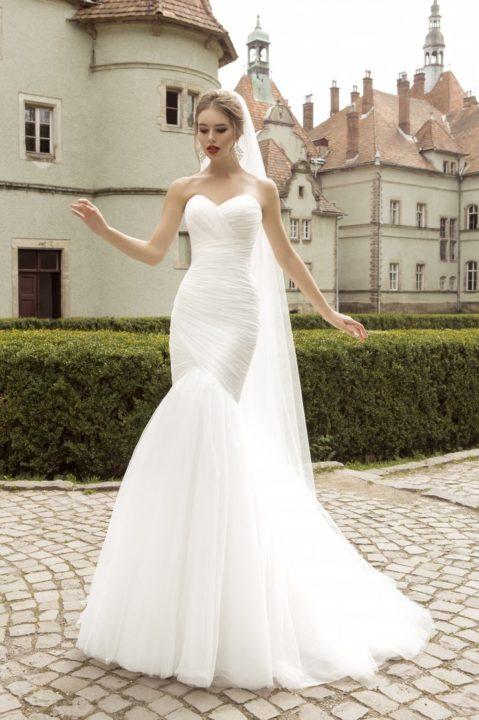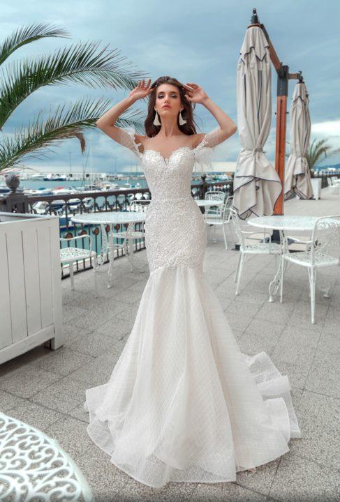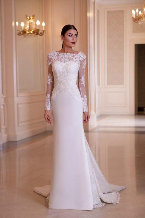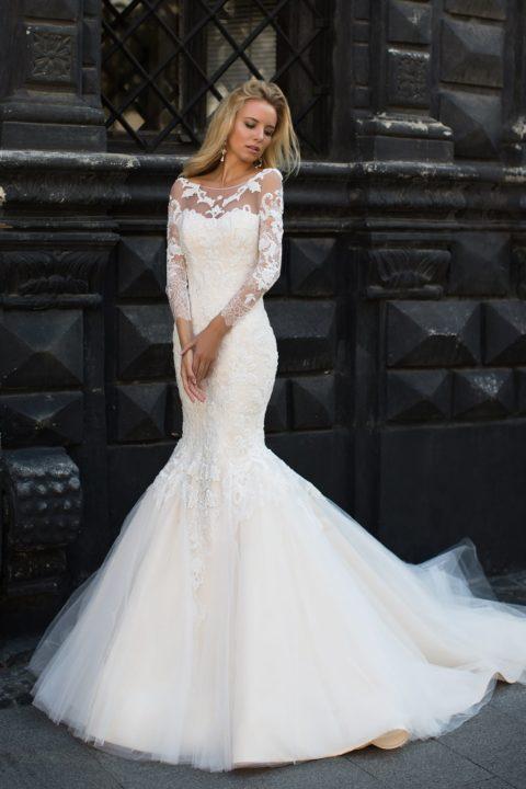 Grâce à la coupe originale, la robe de mariée ressemble à une queue de sirène. Il a toujours un haut ajusté, ainsi qu’une partie jusqu’aux genoux, mais déjà en dessous il a une évasement. Le plus souvent, ces robes sont livrées avec des manches dont la longueur peut varier.