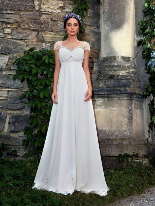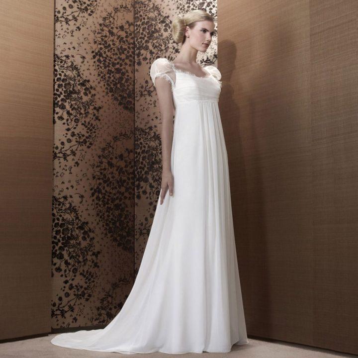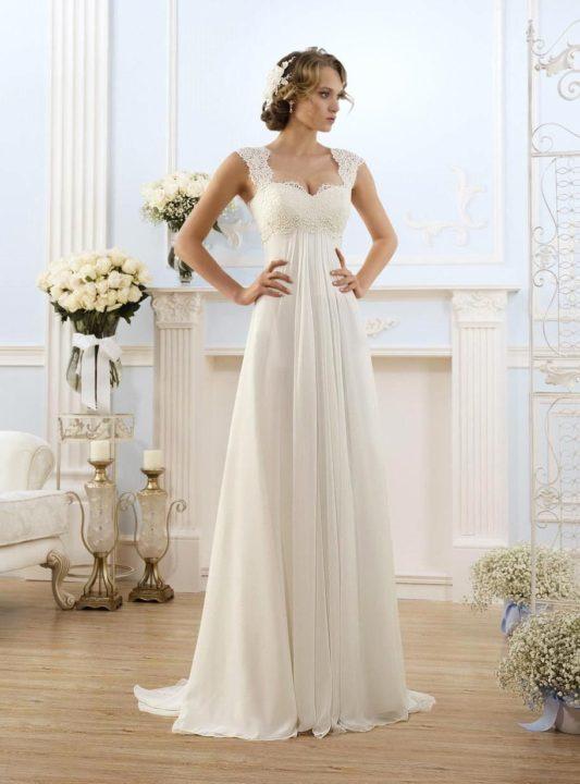 Pour les amateurs d’un style inhabituel – le style grec et Empire est exactement ce dont vous avez besoin. Ces robes se caractérisent par une taille haute qui passe directement sous le buste. Mais le reste de la robe a une extension vers le bas. Ce modèle convient particulièrement aux mariées enceintes, ainsi qu’aux femmes qui ont des problèmes de ventre et de jambes.