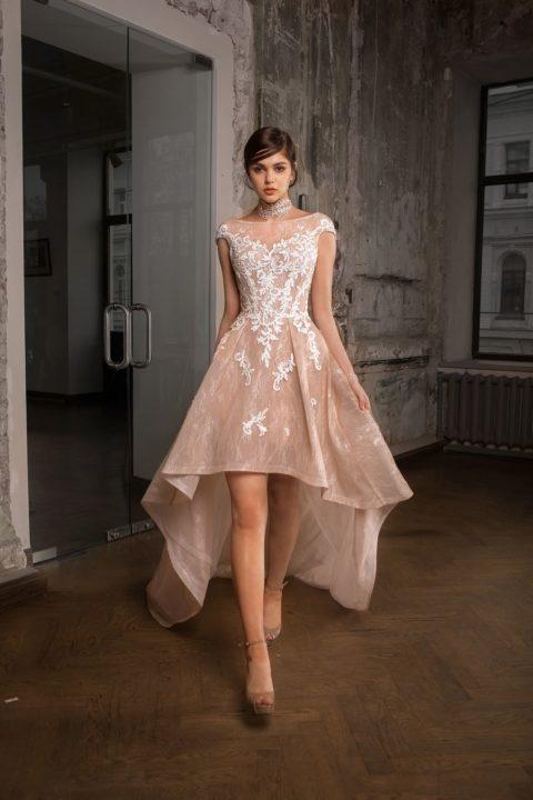 Le style de ces robes diffère en ce qu’il a une jupe plus courte à l’avant et une longue à l’arrière, qui peut se transformer en une traîne de différentes longueurs. Dans certains modèles de robes, les trains peuvent être détachables, ce qui rend la robe encore plus confortable. Ce style de robe peut parfaitement mettre en valeur les jambes élancées de la mariée et rendre visuellement la fille plus grande.