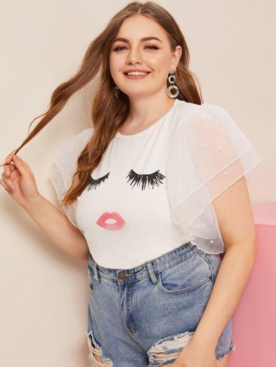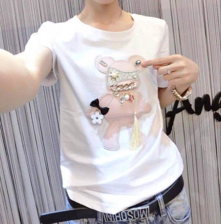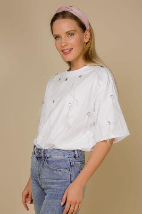 Les T-shirts blancs ornés de perles et de gros strass seront doux et féminins. Et en combinaison avec des choses en denim, un style jeune est maintenu.