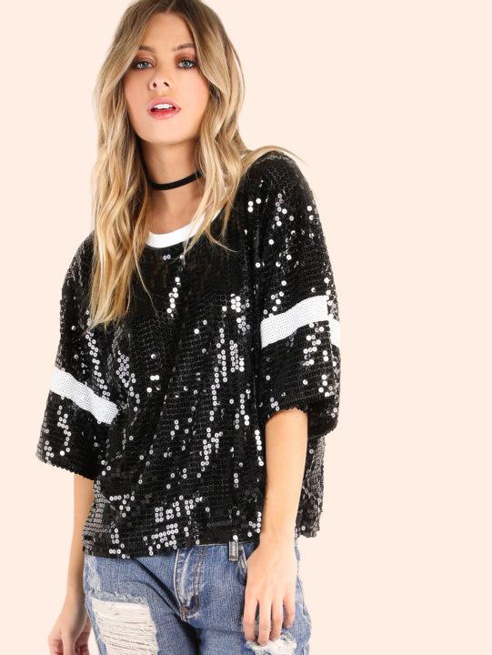 Un ensemble festif créera un T-shirt parsemé de paillettes dorées en combinaison avec un pantalon noir.