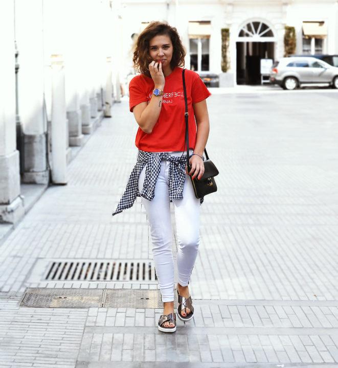 Pour donner à votre look de tous les jours un look frais, associez un t-shirt rouge à des vêtements de couleur claire.