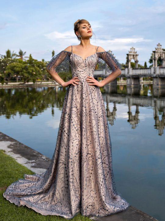 Le modèle de couleur bleue et poudrée aux épaules dénudées et à la manche en tulle originale a l’air chic.