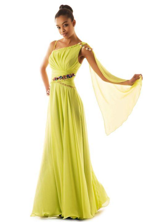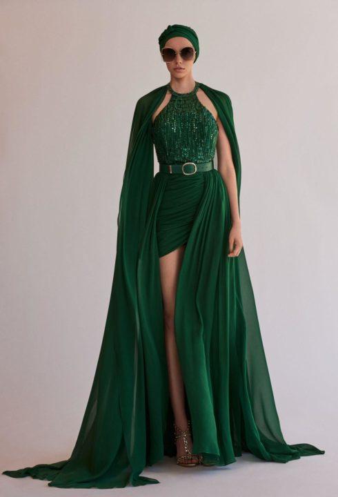 Est également présentée une tenue extraordinaire présentée en vert, une robe courte avec une traîne.