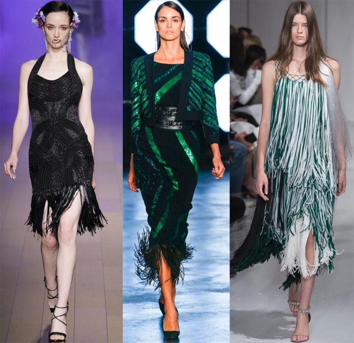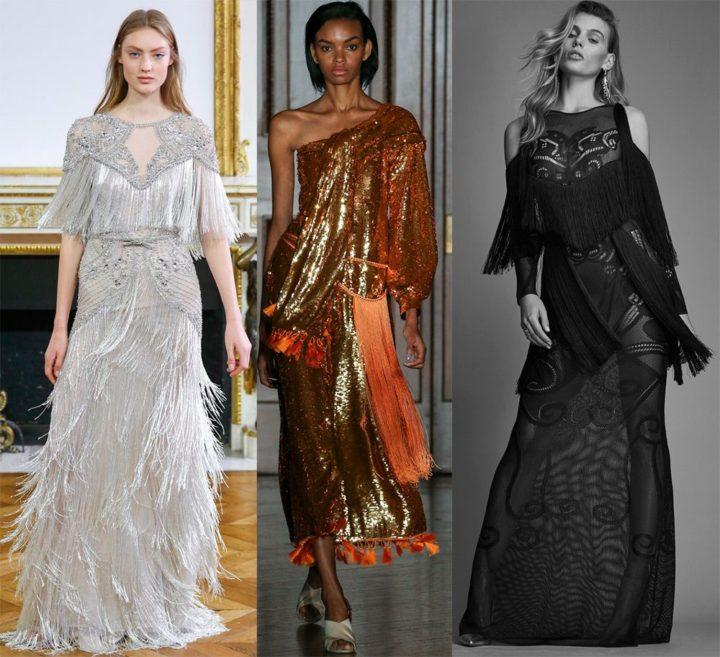 Des robes originales et fluides à franges. Dans les collections de mode, les créateurs ont décoré les manches, les épaules, le corsage, les jupes, ainsi que toute la robe.