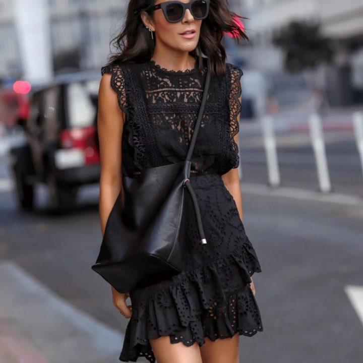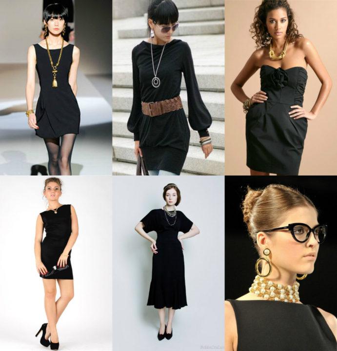 Les modèles ultra-courts d’une robe noire se marient bien avec des pendentifs allongés qui accentuent le décolleté et de grandes boucles d’oreilles. Et aussi des bracelets, des lunettes, ainsi que des petits sacs à main.