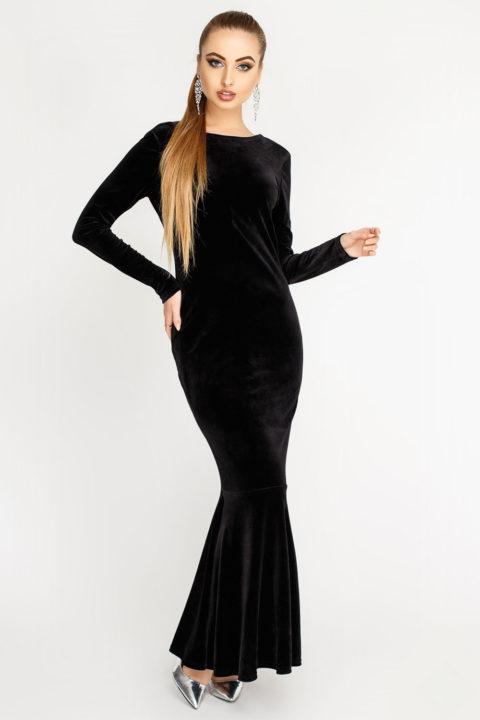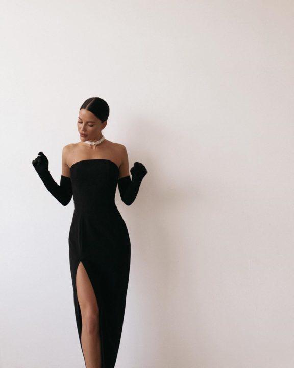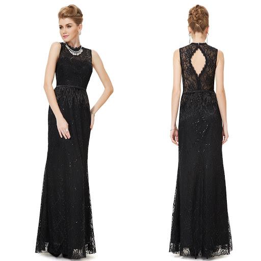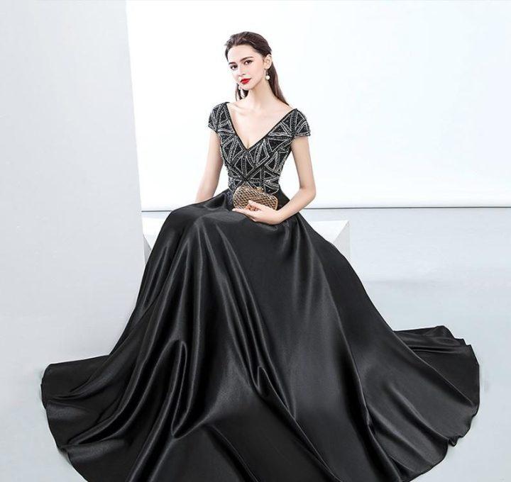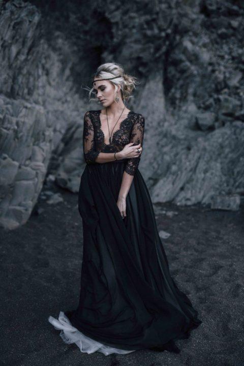La robe longue noire sera noblement complétée par des bijoux avec des pierres précieuses, ainsi que décorée de perles.