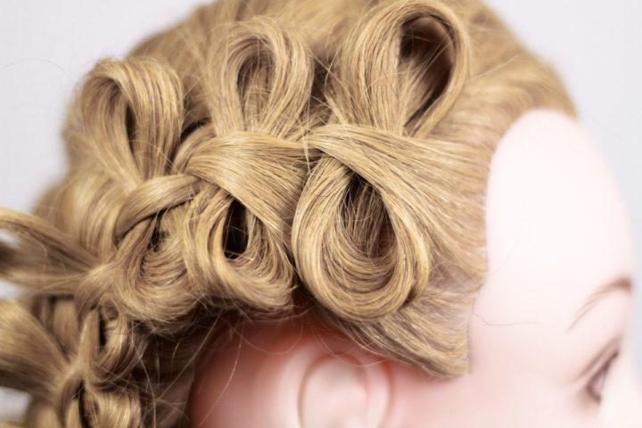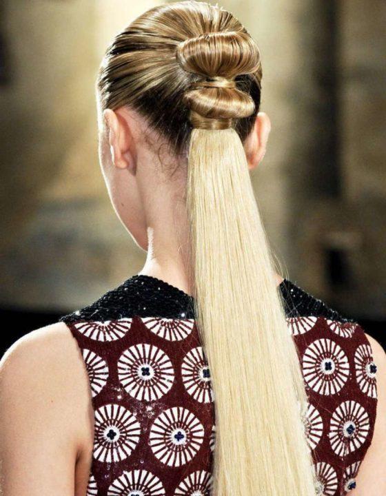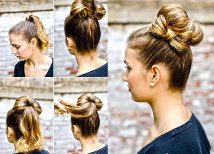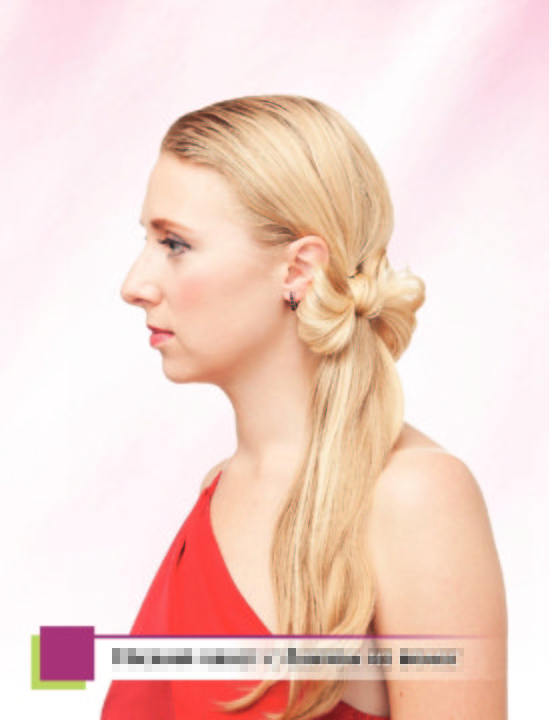 Ensuite, nous enveloppons l’élastique pour les cheveux avec la queue de cheval restante et sécurisons le tout avec invisibilité. Nous redressons les brins épinglés sous la forme d’un arc et d’un vernis.