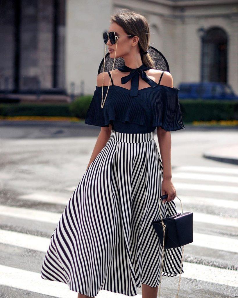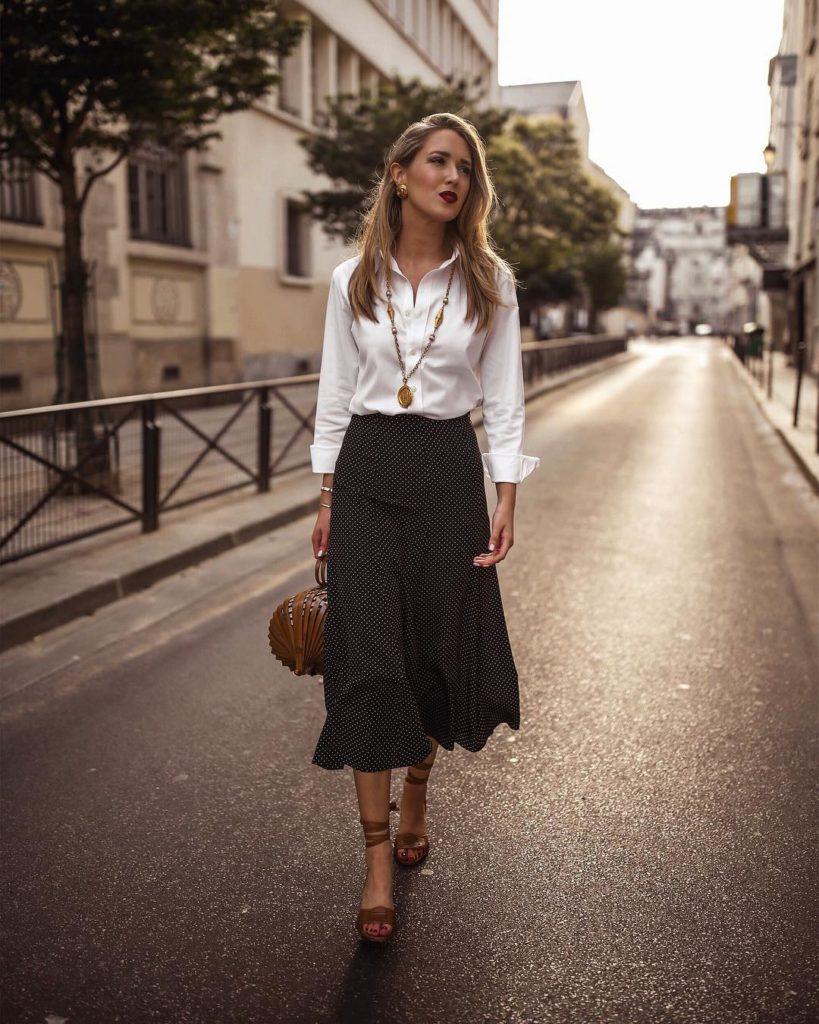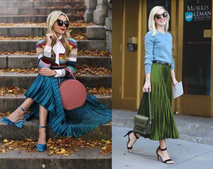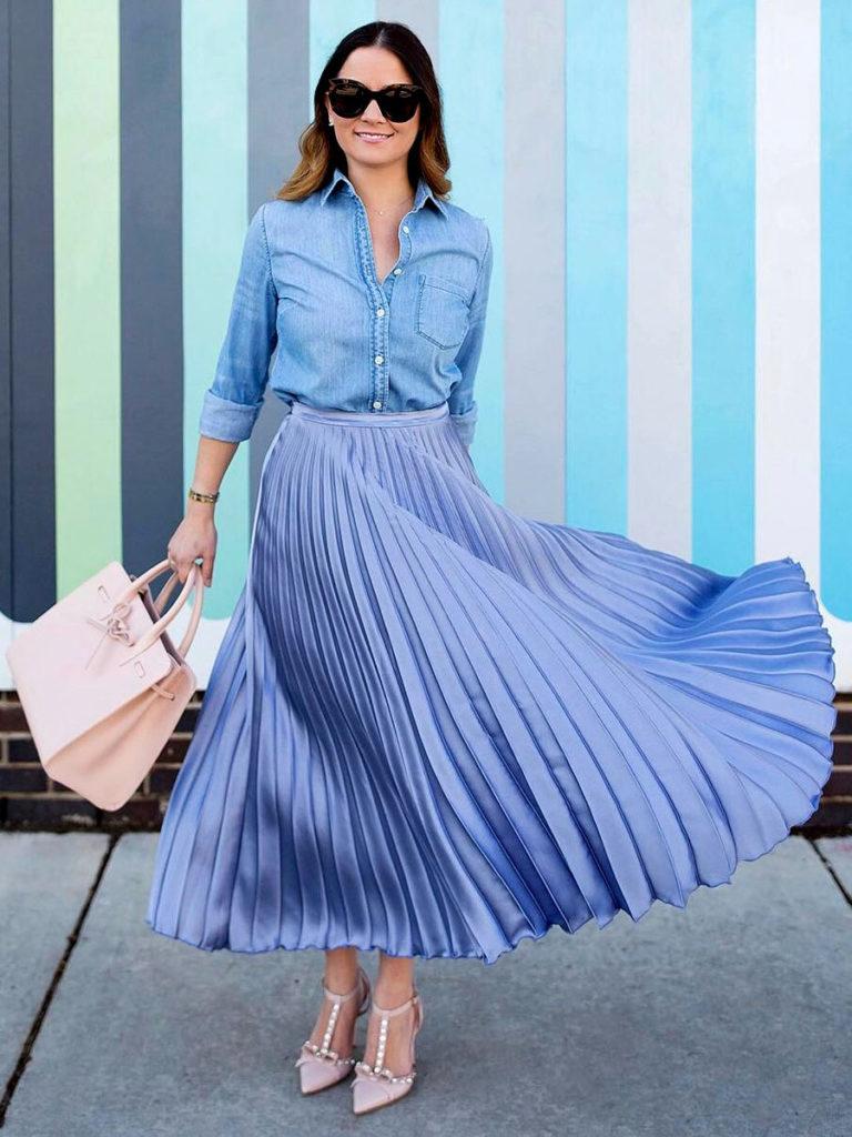 L’option idéale pour mettre en valeur l’image féminine servira de jupes plissées, de jupes au soleil, qui auront une longueur midi. Les couleurs peuvent être choisies brillantes, accrocheuses, mais toujours calmes. Bien sûr, la création d’un arc total de n’importe quelle couleur est autorisée, où il sera nécessaire d’en diluer au moins un avec une excellente couleur ou de sélectionner des vêtements différents dans un ton.