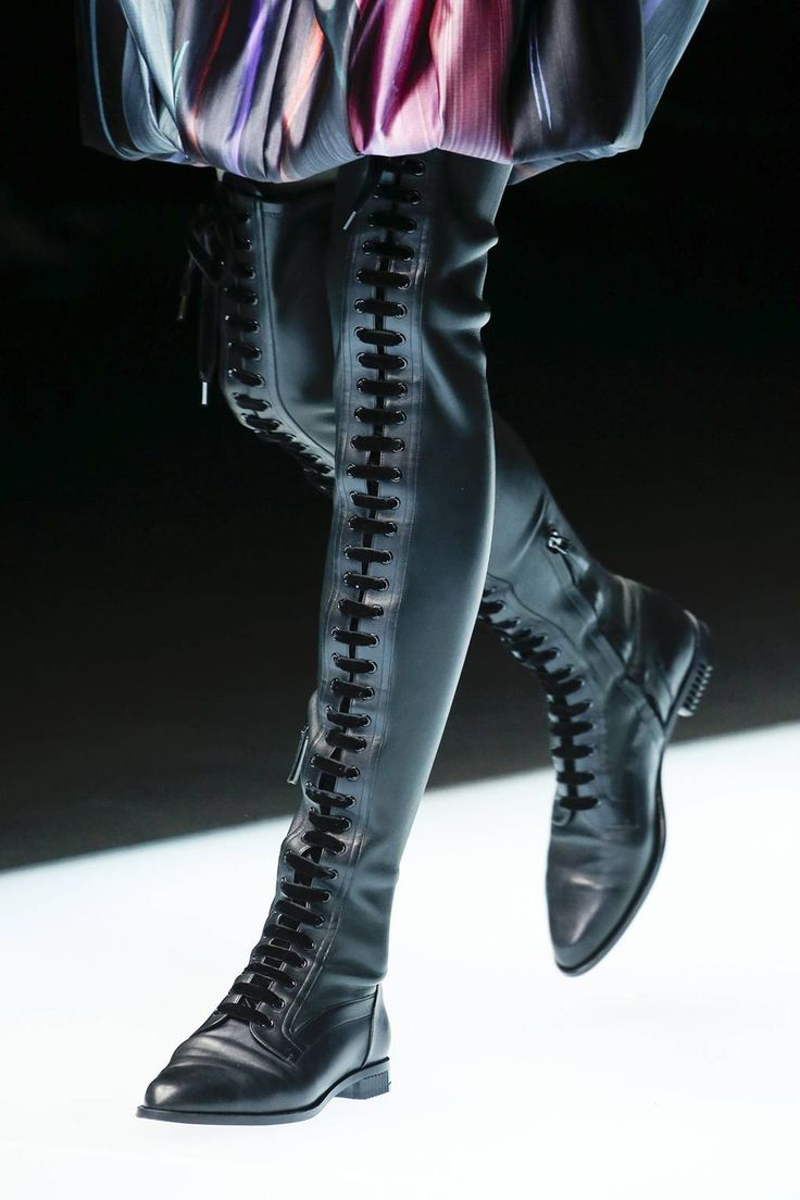 Dans la catégorie des bottes hautes, les cuissardes attirent également l’attention. Ces chaussures étaient déjà pertinentes plus tôt et après des années, elles sont revenues à des postes de direction. Les concepteurs recommandent de prêter attention non seulement aux modèles classiques. En effet, des options encore plus intéressantes sont présentées dans les collections actuelles. Parmi eux se trouvent des chaussures avec laçage, des garnitures en fourrure et même des broderies.