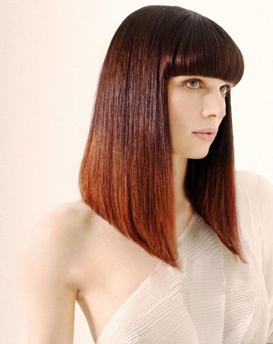 Un visage avec un beau maquillage sera mis en valeur par les cheveux raides qui traînent. Une brosse plate avec un sèche-cheveux nous aidera à créer une trame naturelle de cheveux, il suffit de plier les extrémités des mèches sur toute la longueur. La coiffure est pertinente à la fois pour sortir et pour tous les jours.