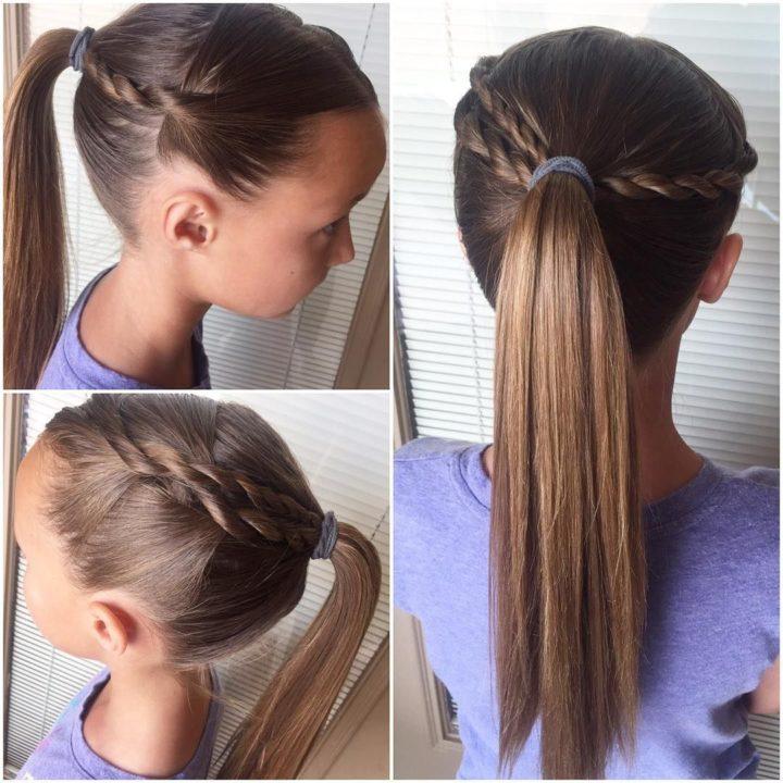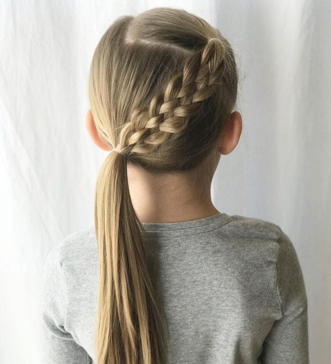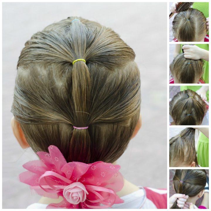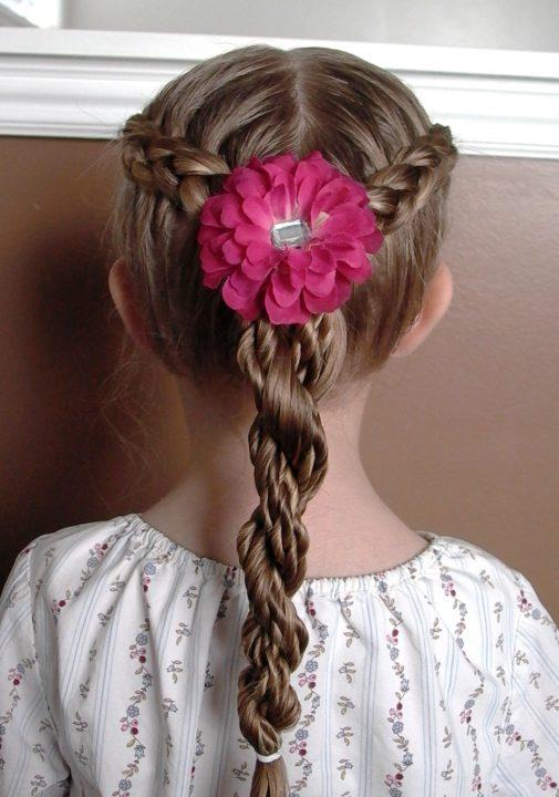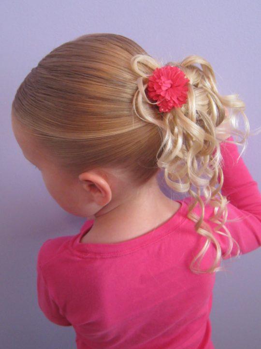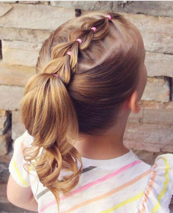 Probablement l’une des coiffures les plus courantes pour les filles à la maternelle. Habituellement, une telle coiffure est réalisée avec une queue de cochon sur la tête, puis l’extrémité libre des cheveux reste dans la queue de cheval.