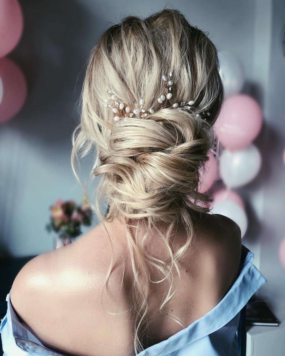 Une coiffure très à la mode – un chignon haut de boucles légères, qui confèrent à la fille de la tendresse et du charme. Pour les fêtes de mariage actives, il est préférable de compléter la version assemblée de la coiffure avec des tresses et des bouffants. Cela aidera à maintenir un look beau et soigné de votre coiffure le plus longtemps possible.