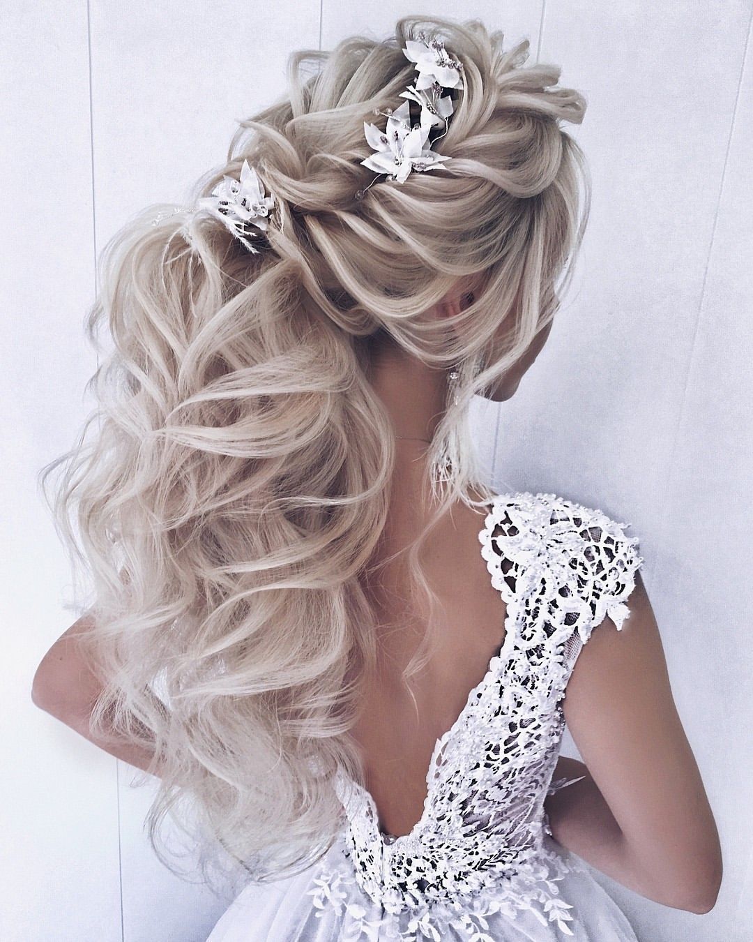 Les mariées aux longues boucles lâches et bouclées seront incroyablement belles, élégantes et féminines. Il est préférable pour les boucles moyennes à grandes qui sont lisses et délicates. En complément, il est à la mode d’utiliser des fleurs fraîches en fonction du ton du bouquet, du diadème, du voile, du bandeau ou du ruban de la mariée. N’oubliez pas le décor universel sous la forme d’épingles à cheveux ou d’épingles à cheveux inhabituelles.