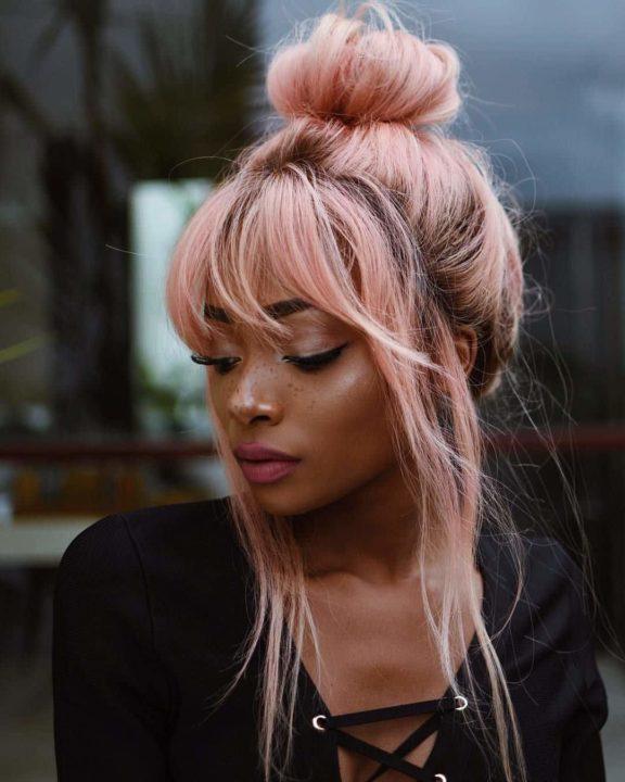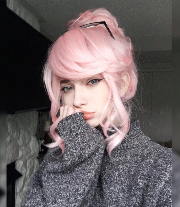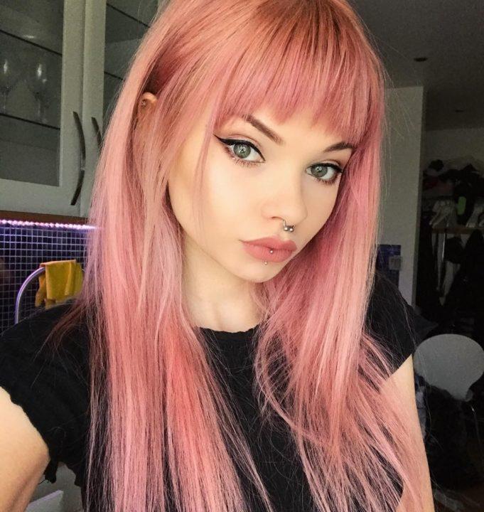 Pour la fille avec une frange, nous avons également trouvé quelques options pour l’apparence de votre image avec des cheveux rose pâle. Ici, les options pour la frange peuvent être différentes. puis une longue ligne droite, biseautée sur le côté, raccourcie droite et ce que vous voulez.