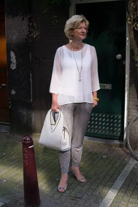 Des jeans et pantalons droits, ainsi que des culottes sont à votre disposition pour des promenades décontractées. Vous ne devez pas utiliser de leggings, à votre âge ce sera inapproprié. Accentuez votre look avec un chemisier ou une veste aux couleurs vives. Et comme chaussures, choisissez des modèles de ballerines, chaussures ou mocassins confortables pour vous.