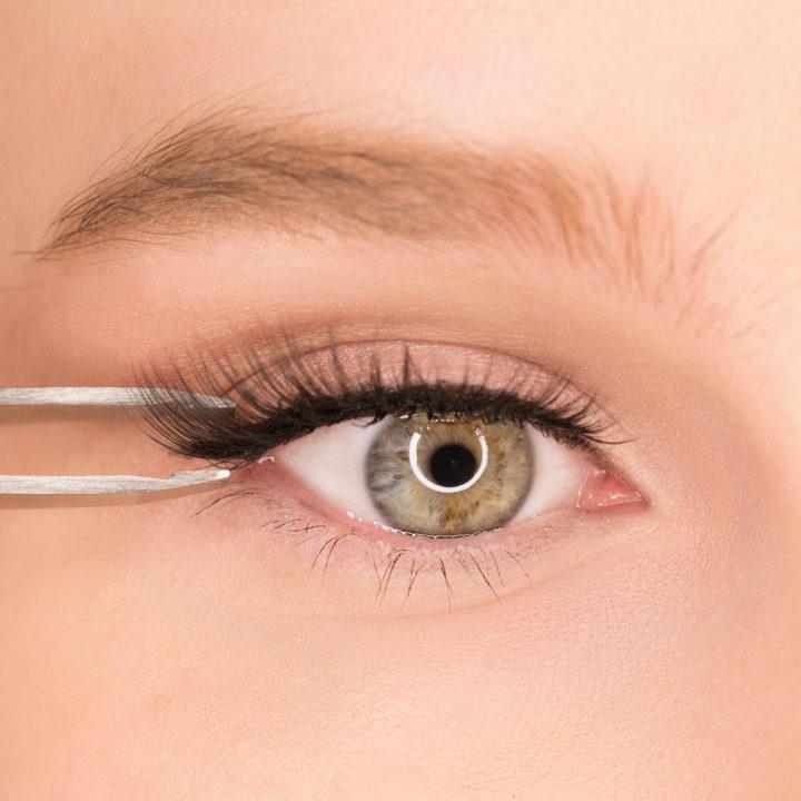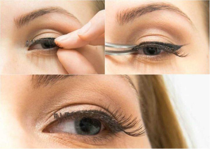 La prochaine étape sera la mise en place. Prenez doucement les cils et appliquez sur l’œil. Si vous n’êtes pas satisfait de la longueur, coupez-la. Maintenant, nous appliquons de la colle sur le ruban à cils, et après 10 secondes, nous collons les cils avec une pince à épiler en partant des coins extérieurs des yeux.