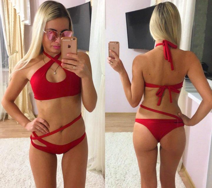 Un autre excellent choix est un maillot de bain, où le corsage a la forme d’un haut. Le haut rend visuellement la silhouette encore plus mince, et si vous êtes de petite taille, alors grâce à un tel maillot de bain, vous paraîtrez plus grand. Le haut lui-même peut se porter sur une épaule, se nouer dans le cou et avoir seulement deux larges bretelles.