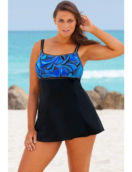 Swimdress est un maillot de bain une pièce qui a un haut moulant qui se fond dans une jupe. La jupe cachera votre bas massif, mettra en valeur la taille et la ligne des épaules s’alignera visuellement avec la ligne des hanches.