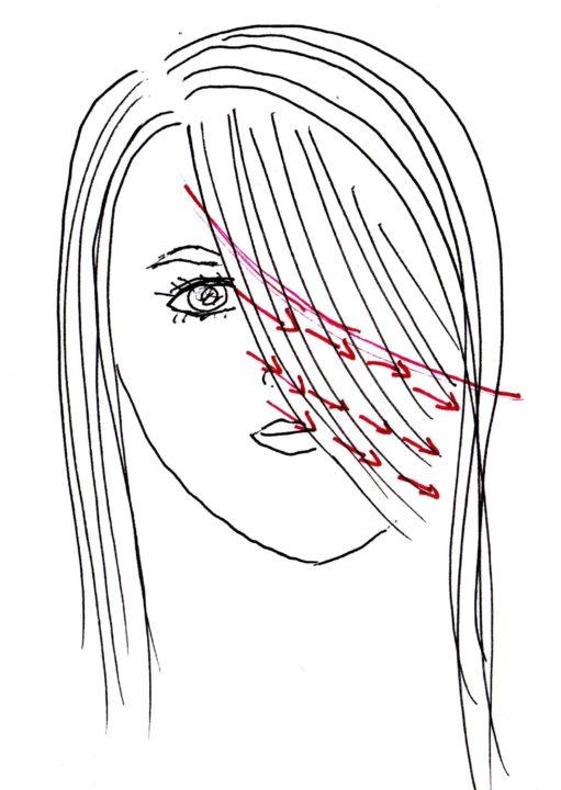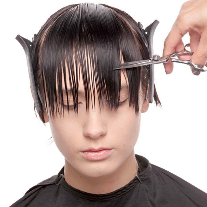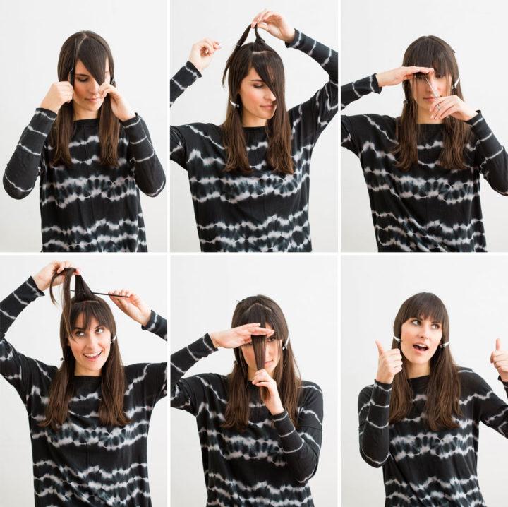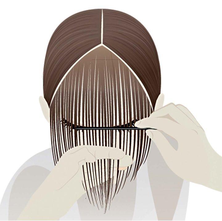 Pour ce type de frange, nous divisons les cheveux en une partie médiane ou légèrement latérale. Ensuite, nous séparons une partie des cheveux par un triangle. Nous faisons le triangle de la taille que vous souhaitez faire la frange. Nous réparons l’excès de cheveux avec des épingles à cheveux.