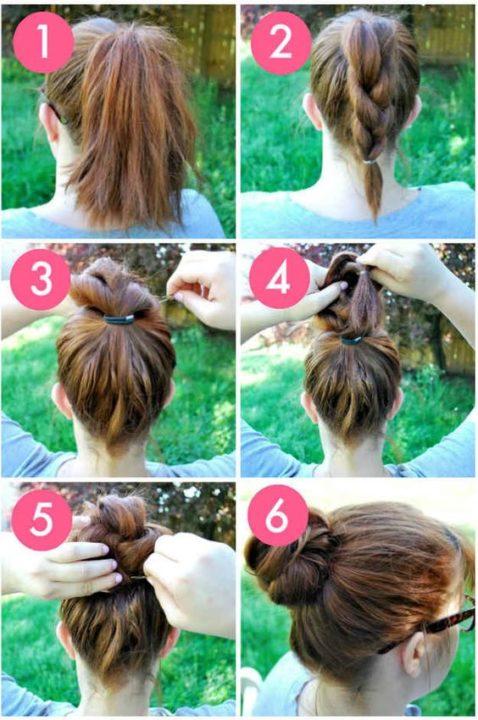Peignez vos cheveux et rassemblez-les en une queue de cheval qui n’est pas haute. Attachez sa base avec une petite bande élastique et tressez la queue de cheval elle-même en une tresse régulière. Lorsque la tresse est prête, enroulez-la autour de la base de la queue en formant un cercle. Vous pouvez cacher la pointe de la queue de cochon dans le chignon lui-même ou l’épingler avec une épingle à cheveux.