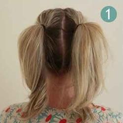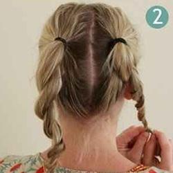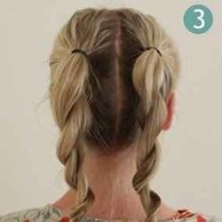 Peignez vos cheveux et séparez-les en deux. De chacun, vous devez tresser les mêmes queues de cheval. Fixez la base de chaque queue de cheval avec un élastique et tordez les extrémités libres en une sorte de paquet serré. Et puis tordez vos deux flagelles ensemble, et attachez les extrémités avec une épingle à cheveux.