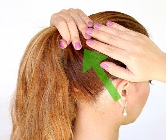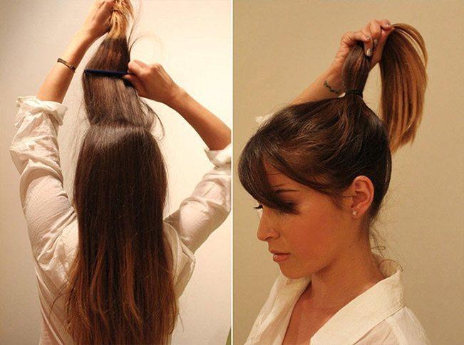 Peignez bien vos cheveux, rassemblez-les en queue de cheval, saupoudrez de vernis et peignez les cheveux avec un peigne dans le dos. Ensuite, ramassez-les en haut de la tête et fixez la queue avec un élastique. N’attachez pas l’élastique à la fin, mais tirez votre queue dans la boucle formée. Étalez la queue de cheval et saupoudrez-la de vernis de fixation.