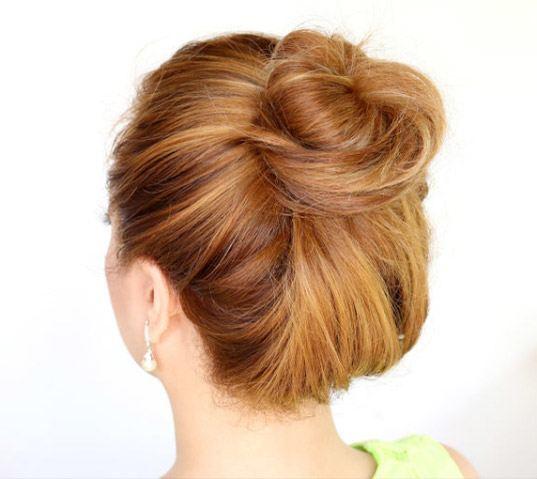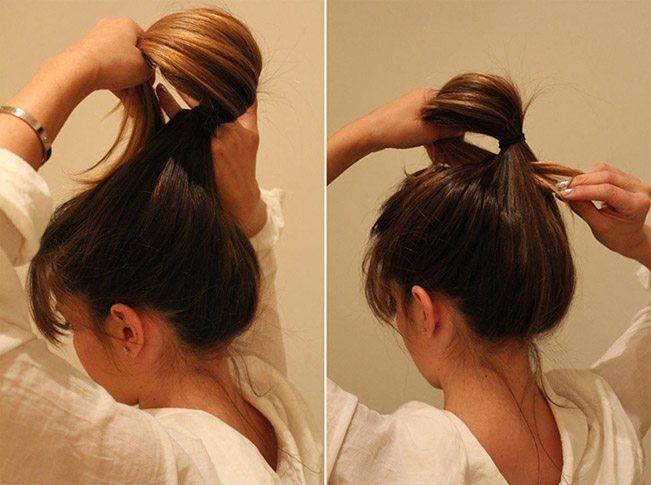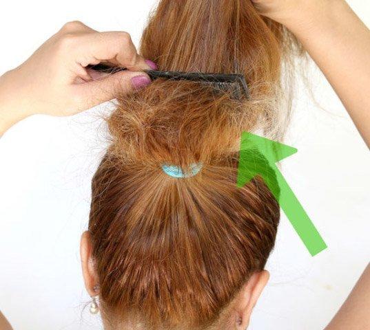 Gardez vos cheveux propres pour un chignon particulièrement attrayant. Peignez vos cheveux et ajoutez-y de la mousse. Ensuite, attachez vos cheveux en une queue de cheval haute. La première fois que vous liez la base de la queue de cheval avec un élastique, ne serrez pas complètement la boucle la deuxième fois. Et à travers le trou résultant, enfilez à nouveau la queue, mais pas complètement. Les extrémités saillantes doivent être peignées pour créer un look décontracté.