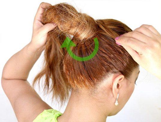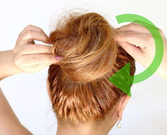 Un tel chignon peut être fait sur des cheveux pas complètement propres. Collectionnez-les en une queue de cheval haute qui sera située sur le dessus de votre tête. Ne serrez pas la base avec un élastique, mais commencez à enrouler la queue autour d’elle. Une fois enveloppé, fixez le bout de la queue avec une épingle à cheveux.