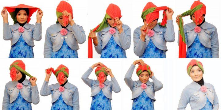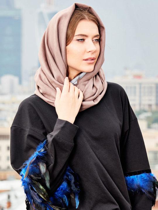 Nous plions l’étole en deux et l’appliquons sur la tête comme une écharpe ordinaire. Ensuite, nous tordons les extrémités de l’étole en un nœud et enroulons sa queue autour de la tête, sans lâcher les extrémités. Lorsque vous enroulez complètement la queue de l’étole autour de votre tête, vous obtiendrez une queue qui dépasse de l’écharpe dans la zone du front – c’est vrai. Ensuite, nous rentrons le bout de la queue dans l’écharpe elle-même sur la tête, et jetons doucement la queue saillante en arrière, comme une mèche de cheveux peignée, et la fixons sous l’écharpe.