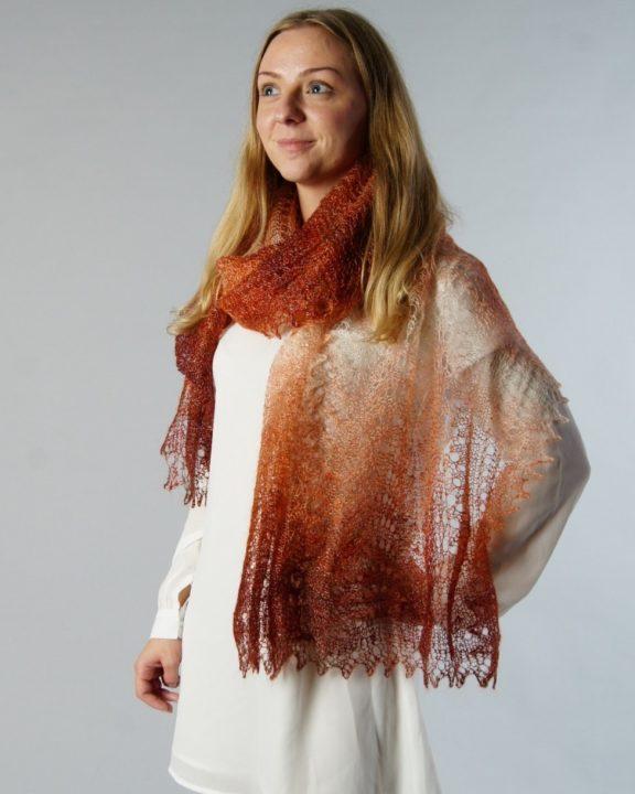 Nous plions l’étole dans le sens de la longueur et la mettons sur le cou sous la forme d’un col. Ensuite, nous tordons la boucle elle-même sur la poitrine sous la forme d’un huit et cachons les deux queues suspendues dans l’anneau résultant. Serrez un peu l’anneau pour le resserrer et les extrémités de l’étole accrocheront bien au nœud.