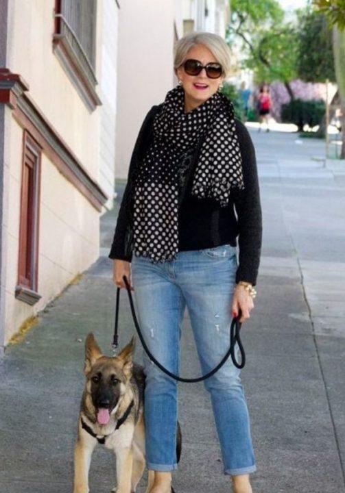 Une femme de plus de 50 ans est une dame respectable qui doit conserver son statut, ce qui concerne principalement la sélection des vêtements. Ainsi, dans le cas des jeans, des motifs lumineux, des applications, une abondance de perles et de strass, ainsi que trop de trous et de patchs déchirés sont inacceptables.