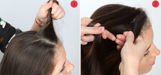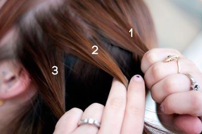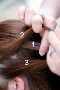 - Prenez une mèche de cheveux dans la zone de la frange, comme indiqué sur l’image et divisez-la en trois mèches égales. Transférez le premier sur celui du centre et placez-y celui de gauche. Ensuite, pour plus de commodité, prenez la tresse dans une main pour que le reste des cheveux ne vous gêne pas.