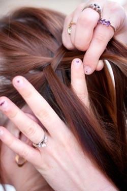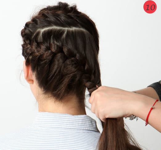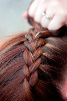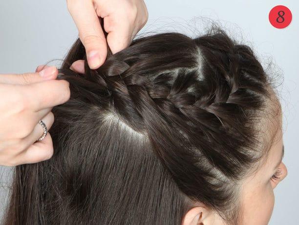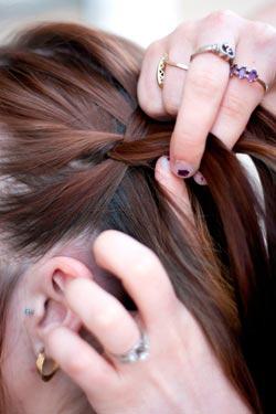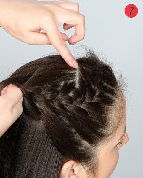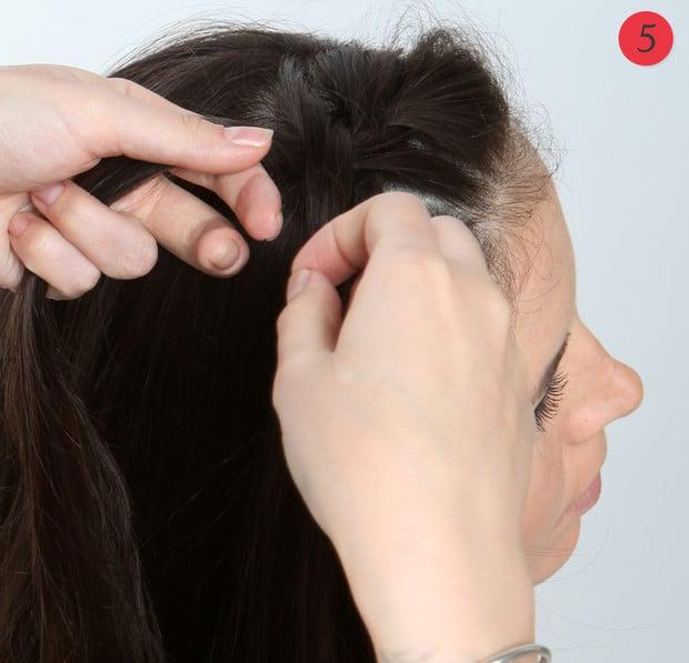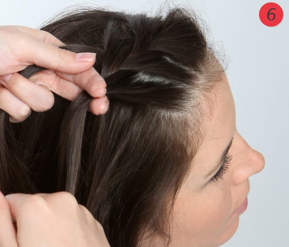 Séparez une mèche de cheveux dans la zone pariétale et divisez-la en trois sections égales. Commencez à lancer le brin droit sur le brin central et le brin gauche sur le brin central. Lancez à nouveau de droite à gauche et commencez à ajouter un brin lâche sur le côté droit.