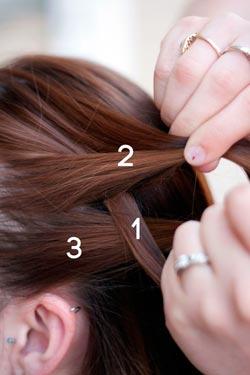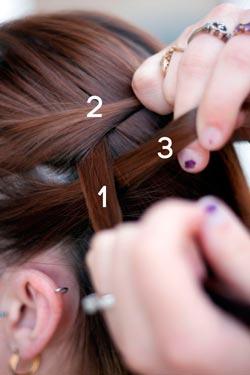 Encore une fois, nous séparons une petite partie des cheveux sur la couronne, que nous divisons en trois brins égaux. Et nous commençons à les tisser. Nous lançons le brin un sous le brin deux, et nous déplaçons le brin 3 sous le brin 1.