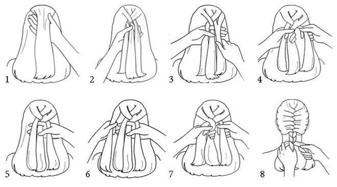 - Effectuez maintenant toutes les mêmes manipulations, uniquement sur le côté gauche. Ainsi, en effectuant des actions aussi simples, vous allez tresser une tresse française ordinaire. Et le tissage lui-même se termine par une tresse ordinaire, qui doit être fixée avec une belle bande élastique.