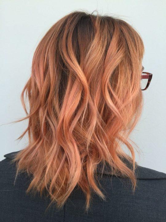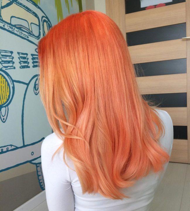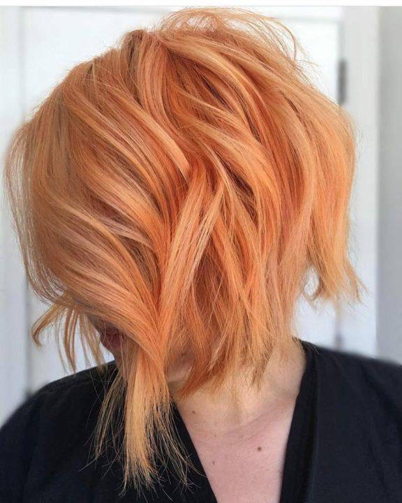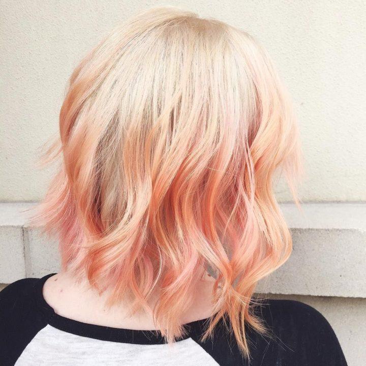 Les cheveux de longueur moyenne auront l’air intéressants en couleur pêche. Ici, vous pouvez à la fois les redresser et créer des ondes lumineuses.