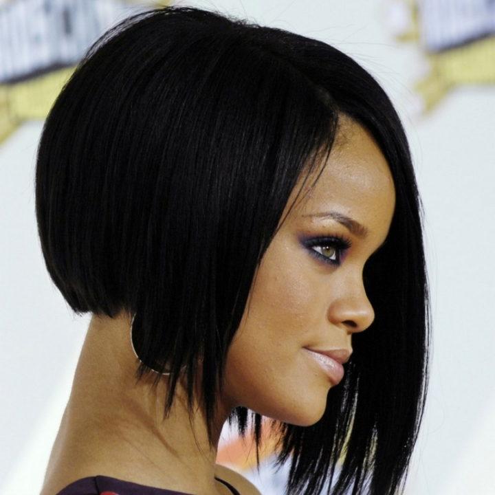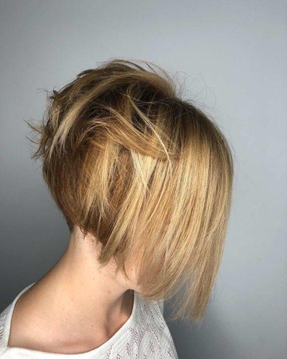 Si vous voulez vous concentrer sur le cou, un bob-bob sur une jambe est votre option idéale. Ici, vous pouvez jouer avec la longueur de la « jambe » rendant l’arrière de la tête plus rasée, ou vice versa, n’affectant qu’une partie des cheveux.