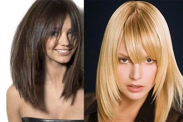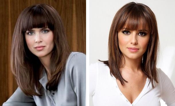 - Il est nécessaire d’utiliser correctement la frange, elle doit être droite, couvrant légèrement les sourcils. Visuellement, le visage prend une apparence plus courte, l’allongement disparaît. Il est préférable de refuser les franges obliques, en raison d’un style inapproprié, cela peut rendre le visage plus étroit.