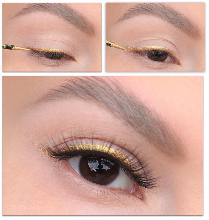 Les flèches dorées peuvent égayer n’importe quel maquillage et le rendre festif. Le fait est qu’un eye-liner ou un crayon doré a une couleur vive et brillante et, dans certains cas, ils contiennent de grandes étincelles. Ces flèches peuvent être dessinées sur la paupière supérieure le long de la ligne des cils, ou vous pouvez souligner la flèche noire, complétant le maquillage des yeux avec du mascara noir.
