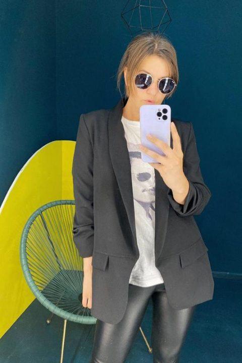 Une veste peut être un excellent choix pour tous les jours, pour le travail et même pour un rendez-vous. C’est une pièce de garde-robe polyvalente qui peut facilement compléter n’importe quel look, que ce soit un nœud professionnel ou un rendez-vous romantique. Avec une telle veste, il vaut toujours la peine de ramasser le bas sous une forme plus ample ou ajustée, sans volume évident.