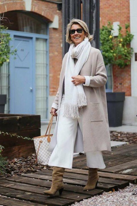 Les stylistes conseillent aux femmes de plus de 50 ans de porter des vêtements d’extérieur faits de matériaux coûteux et de haute qualité. Évitez les vestes et les doudounes bouffantes. À votre âge, il n’est pas approprié de porter de telles choses. Vous pouvez les remplacer par d’élégants manteaux et ponchos en sable, beige et gris.