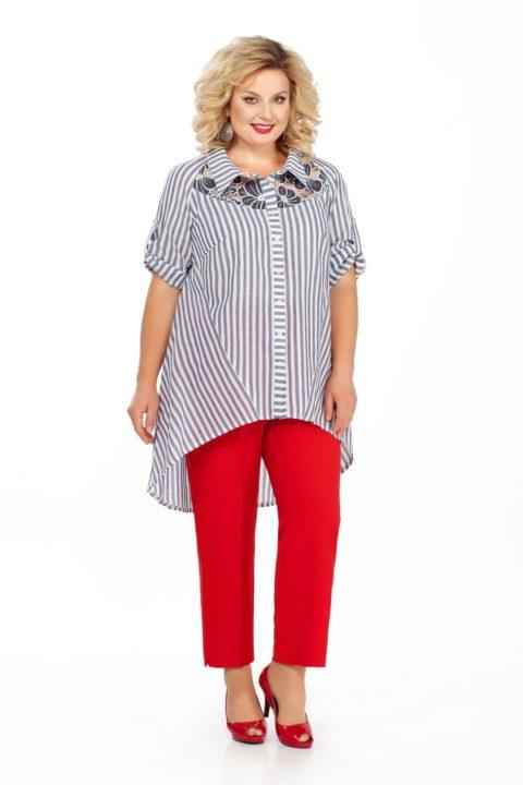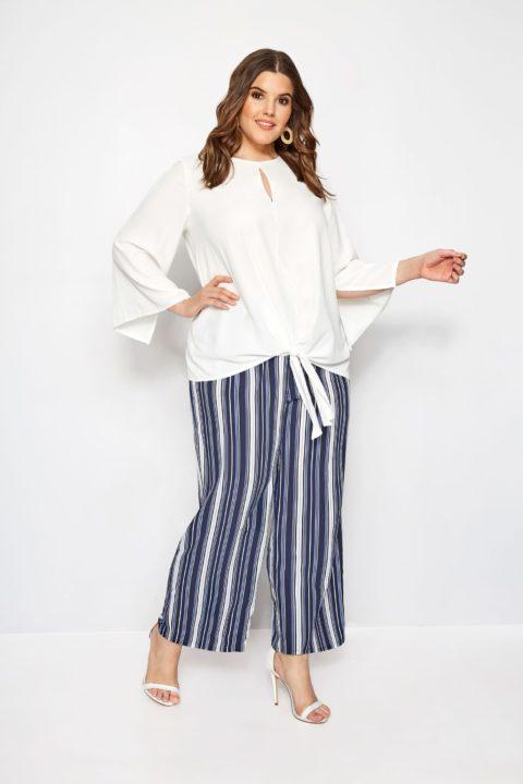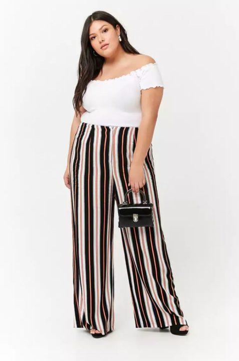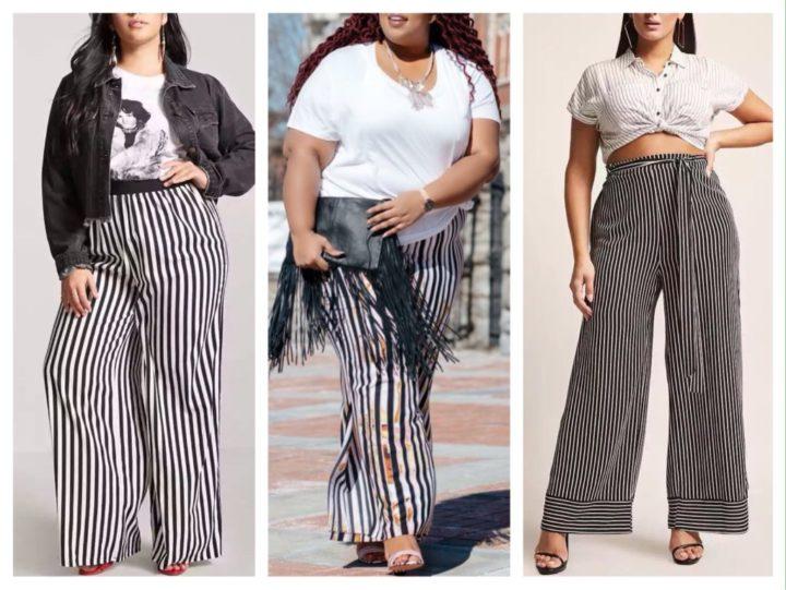 Un excellent choix pour tous les jours est le pantalon à rayures. Le style de pantalon lui-même peut être n’importe lequel, où vous les sélectionnerez en fonction des caractéristiques de votre silhouette. Après tout, les pantalons volumineux pourront cacher les cuisses à problèmes, et les pantalons à taille haute peuvent cacher le ventre et rétrécir visuellement la taille.