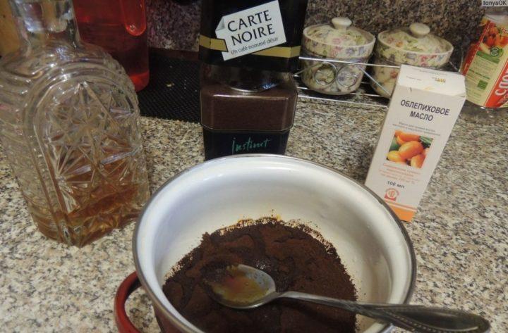 Pour préparer, mélangez: 3 cuillères à soupe. café moulu, 4 c. huile d’argousier, 2 cuillères à soupe rhum, et ajoutez 2 jaunes. Mélangez le tout soigneusement et appliquez sur les cheveux pendant 20 minutes.