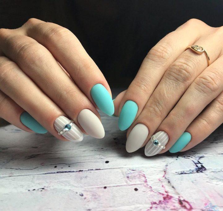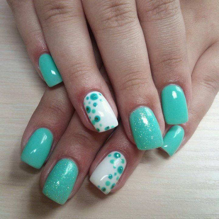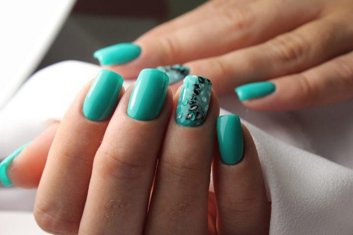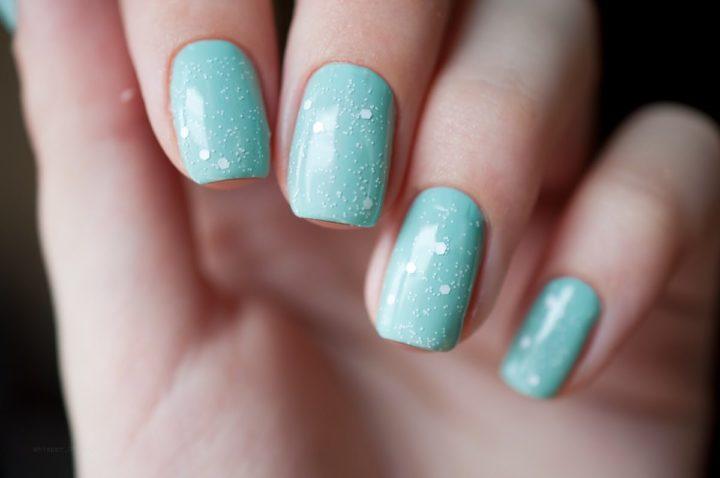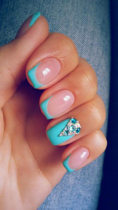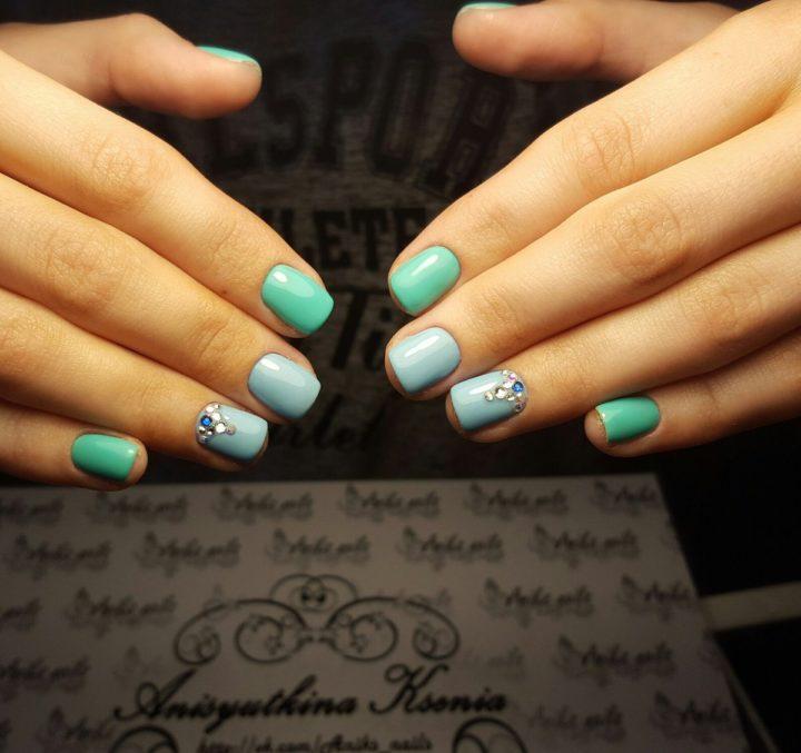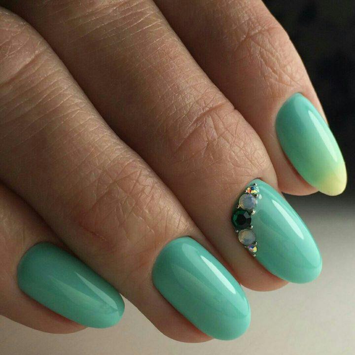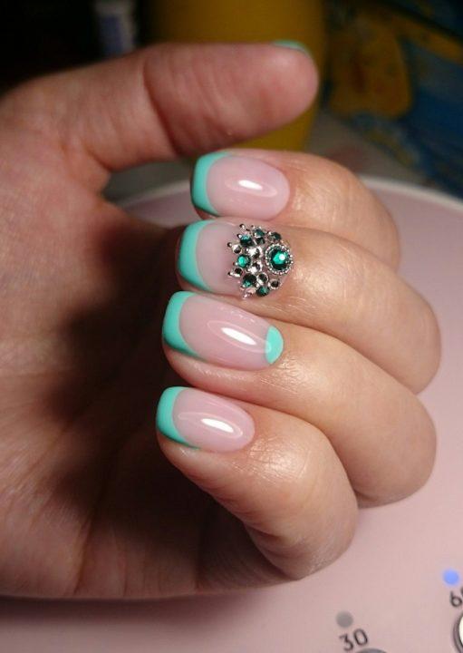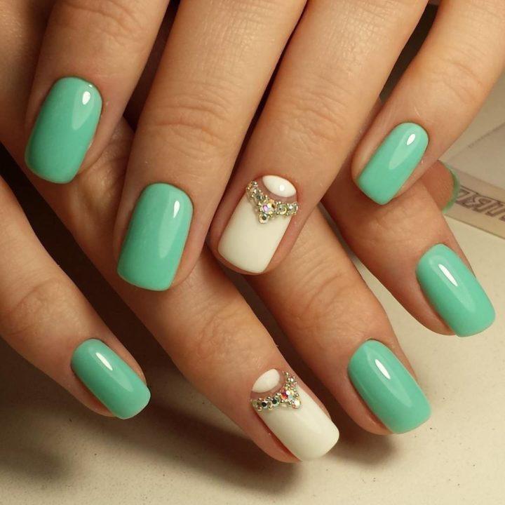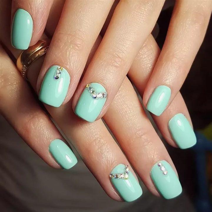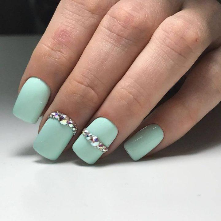 Les strass sont bien sûr l’amour des filles de tous âges. Il n’est pas si difficile de faire une manucure à la menthe avec eux. Cela vaut la peine d’ajouter quelques strass à un ou deux ongles et le tour est joué. Et l’effet d’une telle manucure à la menthe sera tout simplement charmant.