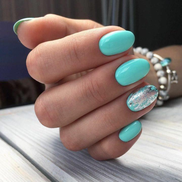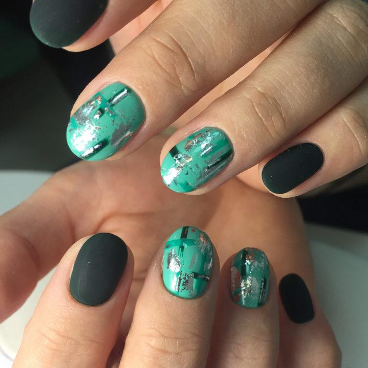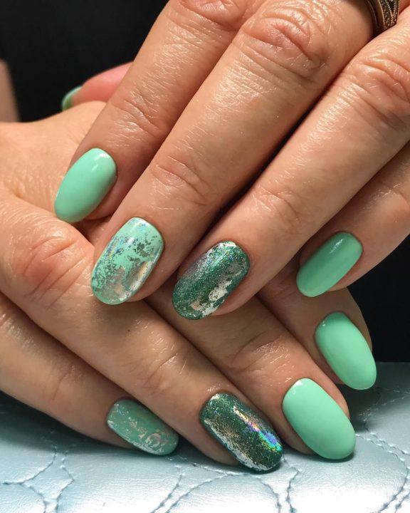 La feuille est souvent utilisée pour la conception de manucure. Et la manucure à la menthe ne faisait pas exception. Il ne sera pas difficile de faire une telle manucure même à la maison. Le papier d’aluminium peut être utilisé en petits morceaux, comme du verre brisé, ou simplement imprimé sur une manucure.