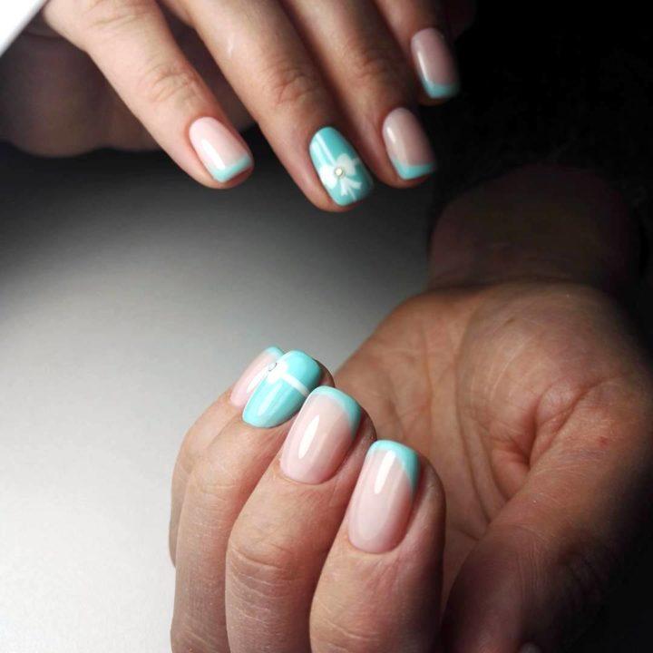 La manucure française a depuis longtemps cessé d’être perçue dans son design blanc classique. Maintenant, vous pouvez facilement expérimenter la coloration de la ligne du sourire d’un souci. Et la couleur menthe sera très utile pour cette version de la manucure française.