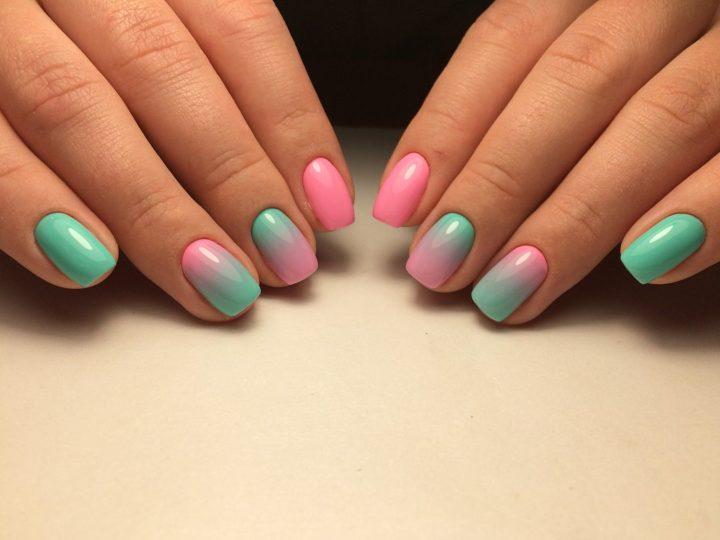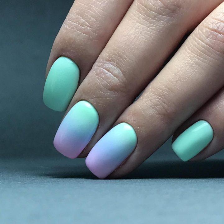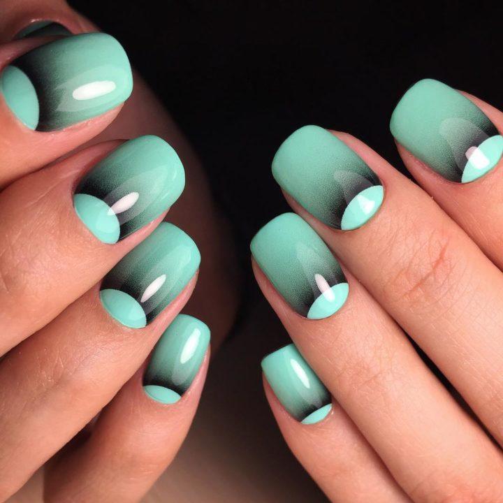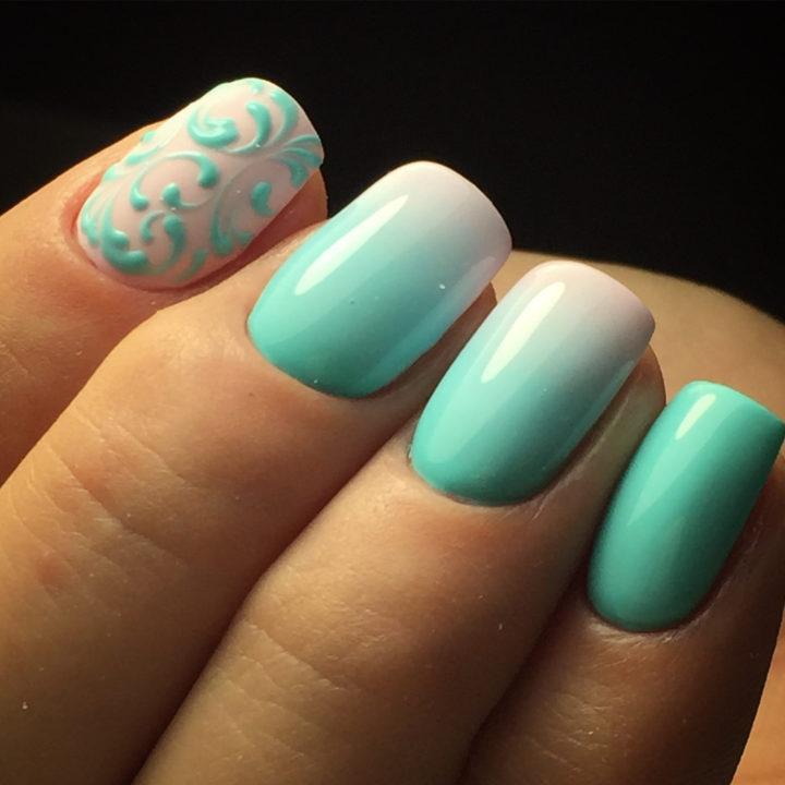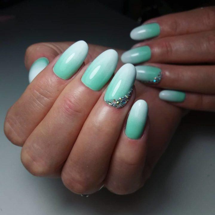 La manucure dégradée est très douce et soignée. La manucure à la menthe dans cette conception peut être en différentes versions. La transition ne peut être effectuée que dans des tons menthe. Ou vous pouvez utiliser d’autres couleurs telles que le rose, le lilas, le blanc. L’essentiel est qu’ils aient le même ton que la menthe.