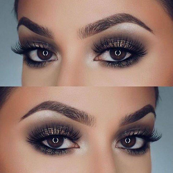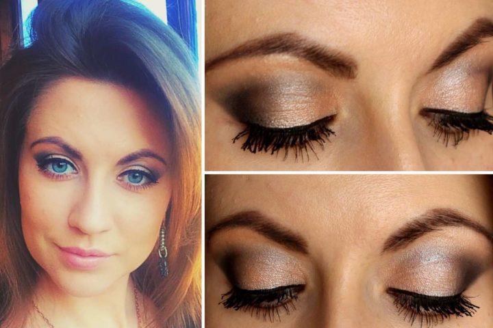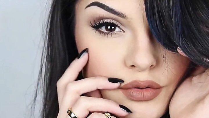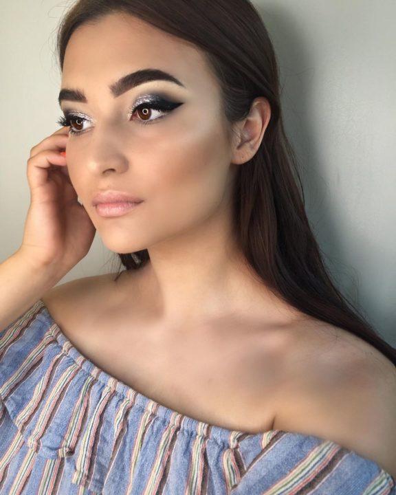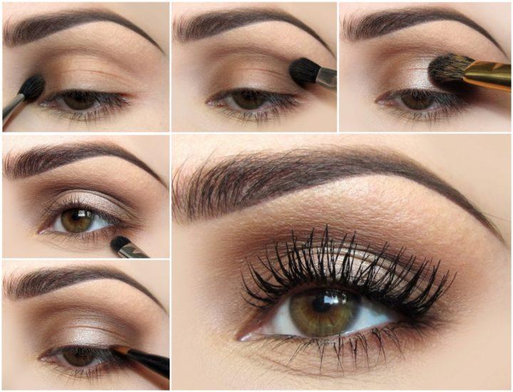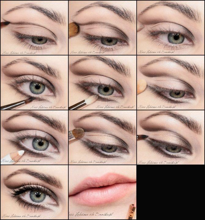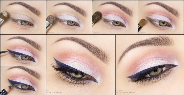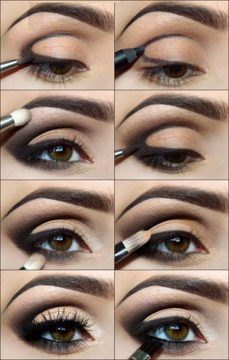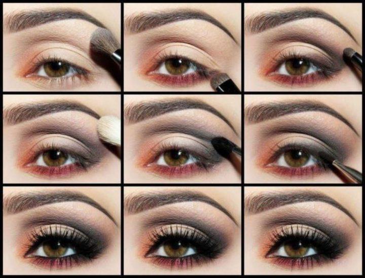 Ensuite, nous commençons à travailler avec les ombres. Appliquez des ombres sombres au coin de l’œil et des ombres plus claires à l’intérieur. Mélangez bien la bordure afin que l’endroit où les deux ombres fusionnent ne soit pas visible. Ensuite, vous pouvez dessiner une flèche sur la paupière supérieure à l’aide d’un eye-liner ou d’un crayon noir.