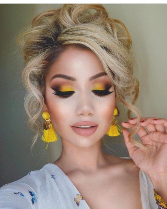 Les ombres jaunes ont beaucoup de nuances différentes. En 2019, n’importe lequel d’entre eux est autorisé, ainsi que des combinaisons inhabituelles avec d’autres nuances. Le jaune est en parfaite harmonie avec les ombres vertes, bleues et blanches. Mais avec le noir, vous pouvez faire un maquillage luxueux pour la soirée.